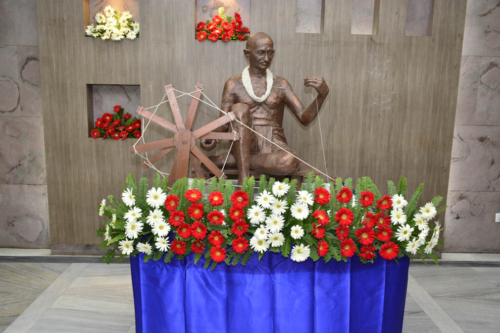 बापू की प्रतिमा चरखा कटाई करते हुए